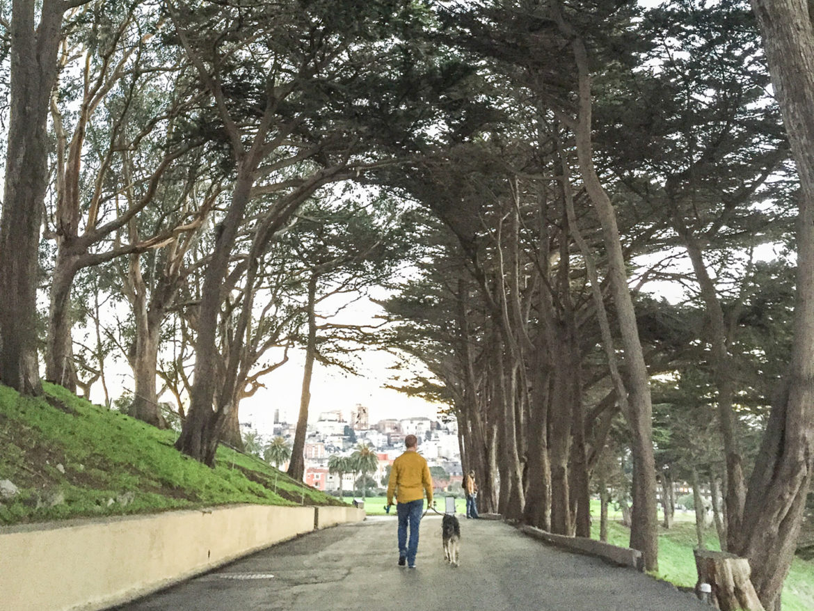 Afterwards, we’d making a slight uphill climb to enter a beautiful tree-lined path. This opened up onto the expansive Great Meadow Park at Fort Mason, filled with people relaxing, exercising and walking dogs. From here, we’d make our way up winding staircases, through hilltop parks and eventually reach home.